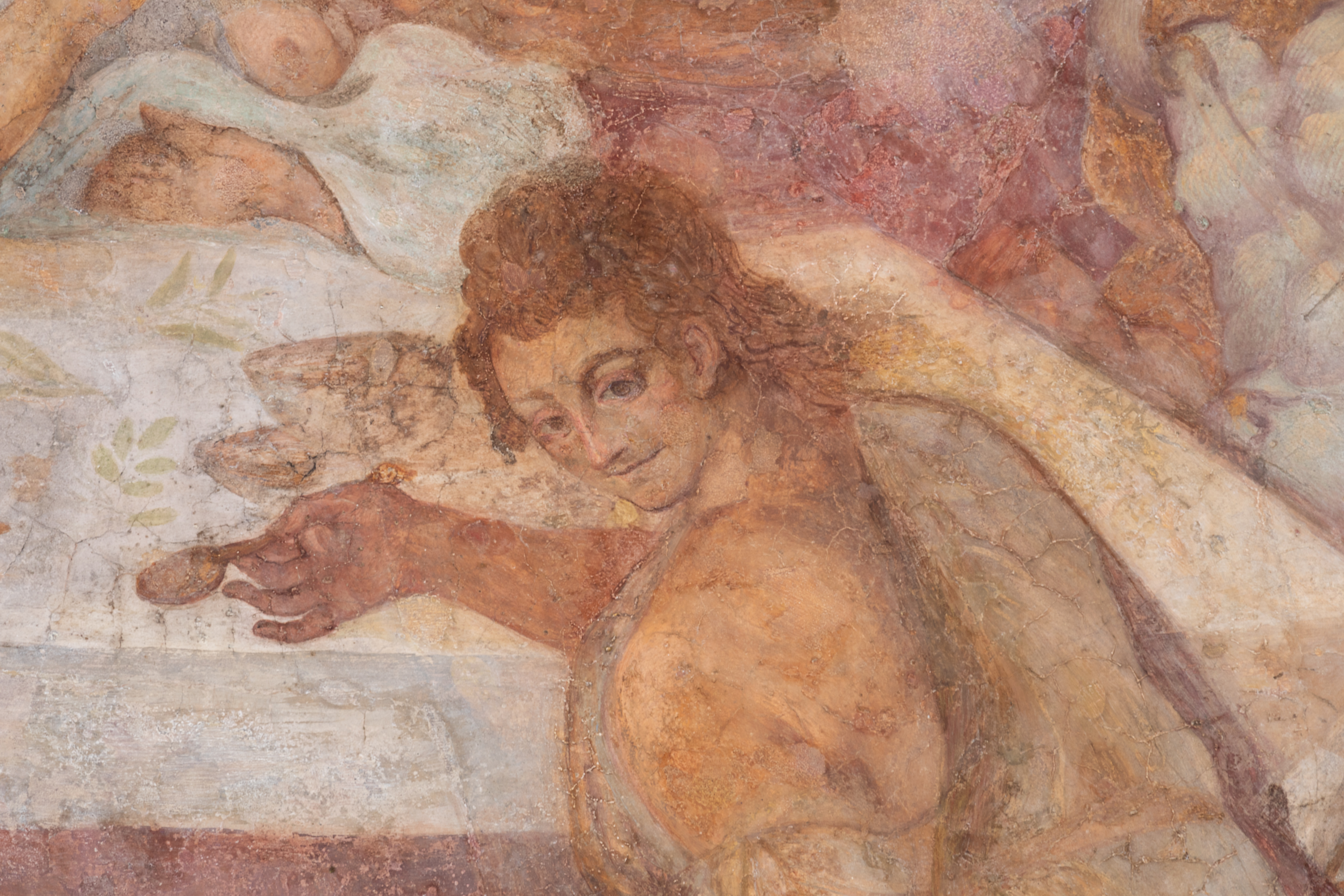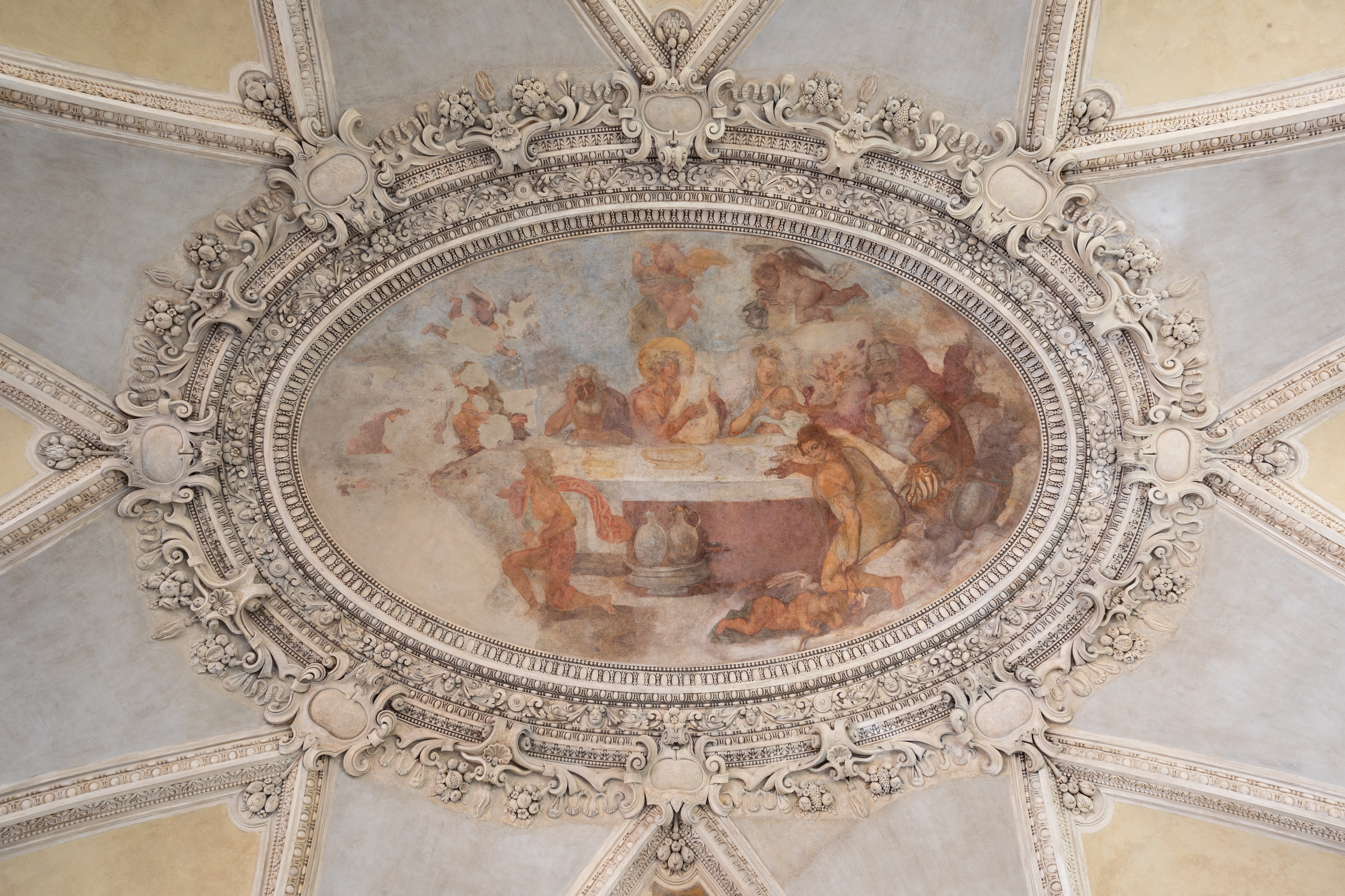 The Loggia dei Vini is part of a larger architectural ensemble, which includes the underground wine grotto, once used for storage, linked to the Villa Borghese Casino through a subterranean passage. Closed to the public for years, the Loggia now comes back to life, following the first of three restoration phases, which focused on the internal vault, stucco frames, and central fresco — painted by Archita Ricci and depicting The Feast of the Gods — as well as the pillars, which had suffered from water infiltration, and the access stairs.